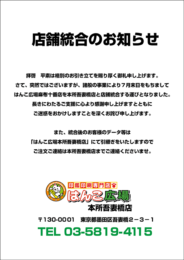 8月以降のお問い合わせやご注文に関しましては「本所吾妻橋店」にて承ります